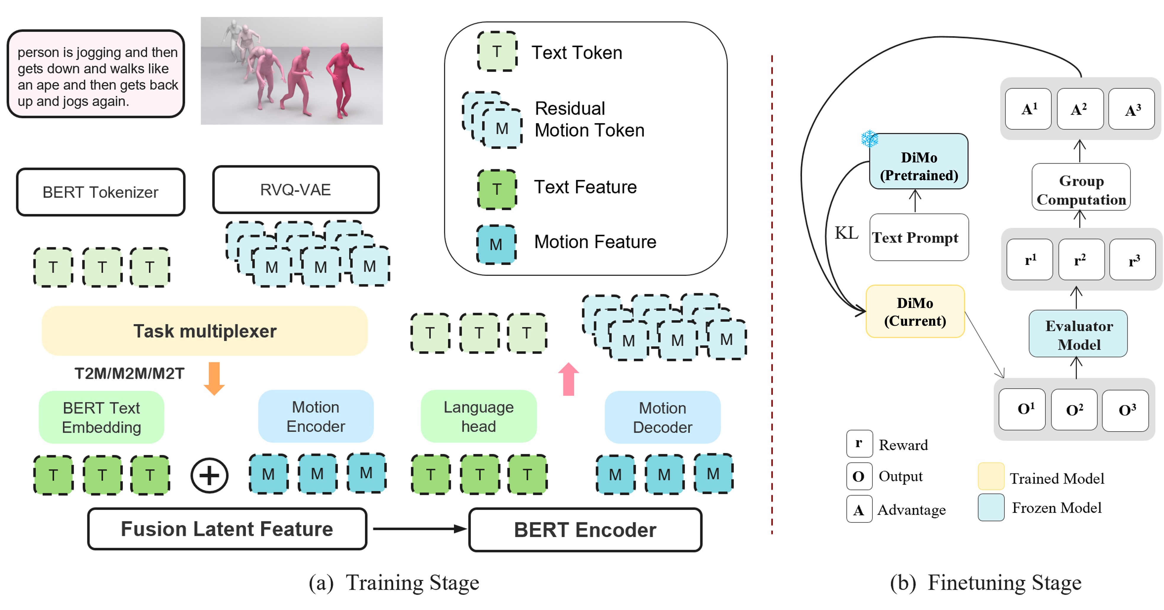 DiMo is a unified framework for bidirectional text-motion generation, inspired by the recent success of discrete diffusion language models (dLLMs). Instead of sequentially autoregressing tokens, dLLMs apply random masking and iterative denoising, which naturally supports parallel inference. This allows the model to refine corrupted sequences in multiple steps, dynamically revise low-confidence predictions, and leverage bidirectional attention for stronger contextual reasoning.