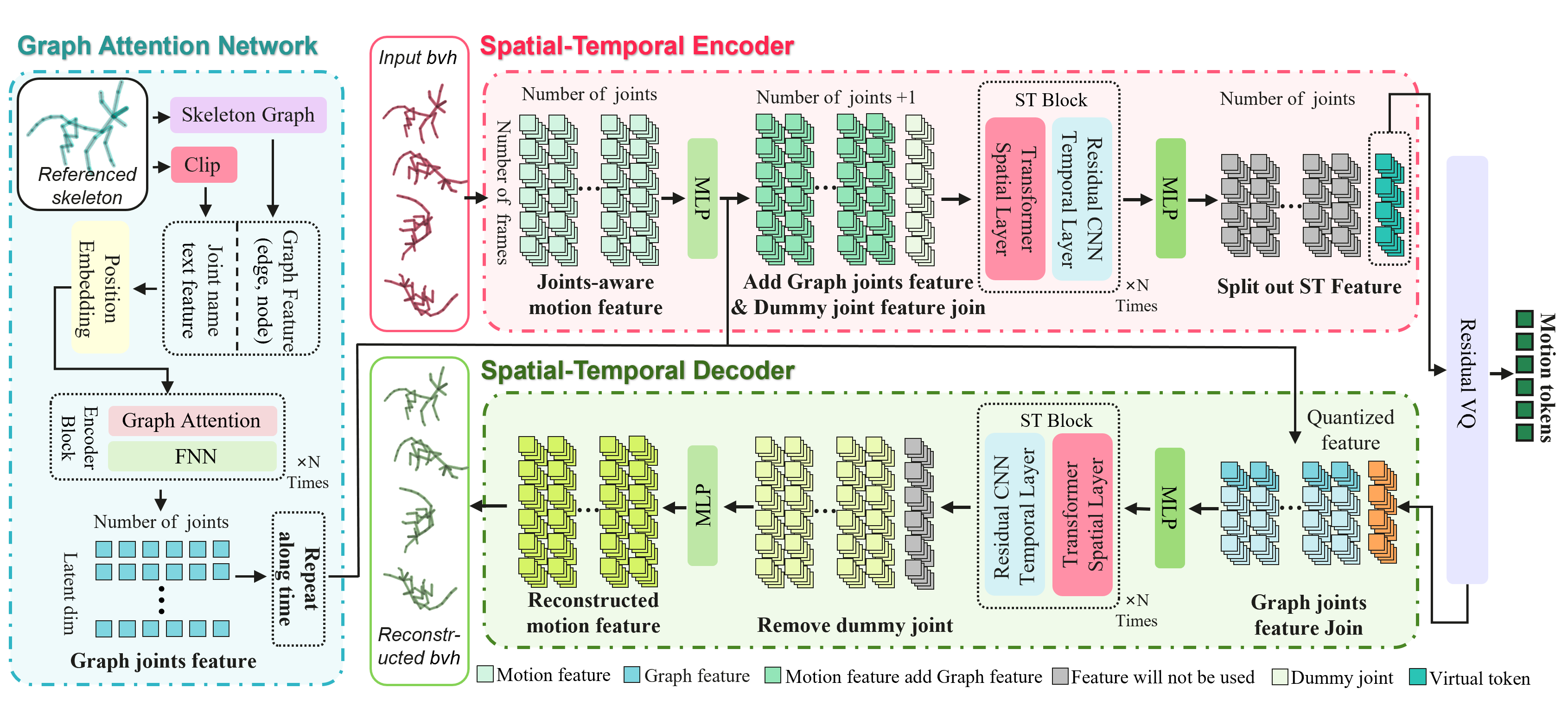 Overview of NECromancer (NEC). NEC consists of two main components: (a) Ontology-aware Skeletal Graph Encoder (OwO), which encodes static skeletal information (topology, joint names, rest pose) into structured graph-based joint features;(b) Topology-Agnostic Tokenizer (TAT), including Spatio-Temporal Encoder and Decoder, which maps motion sequences into a unified feature space, appends virtual joints, and converts them into discrete motion tokens.