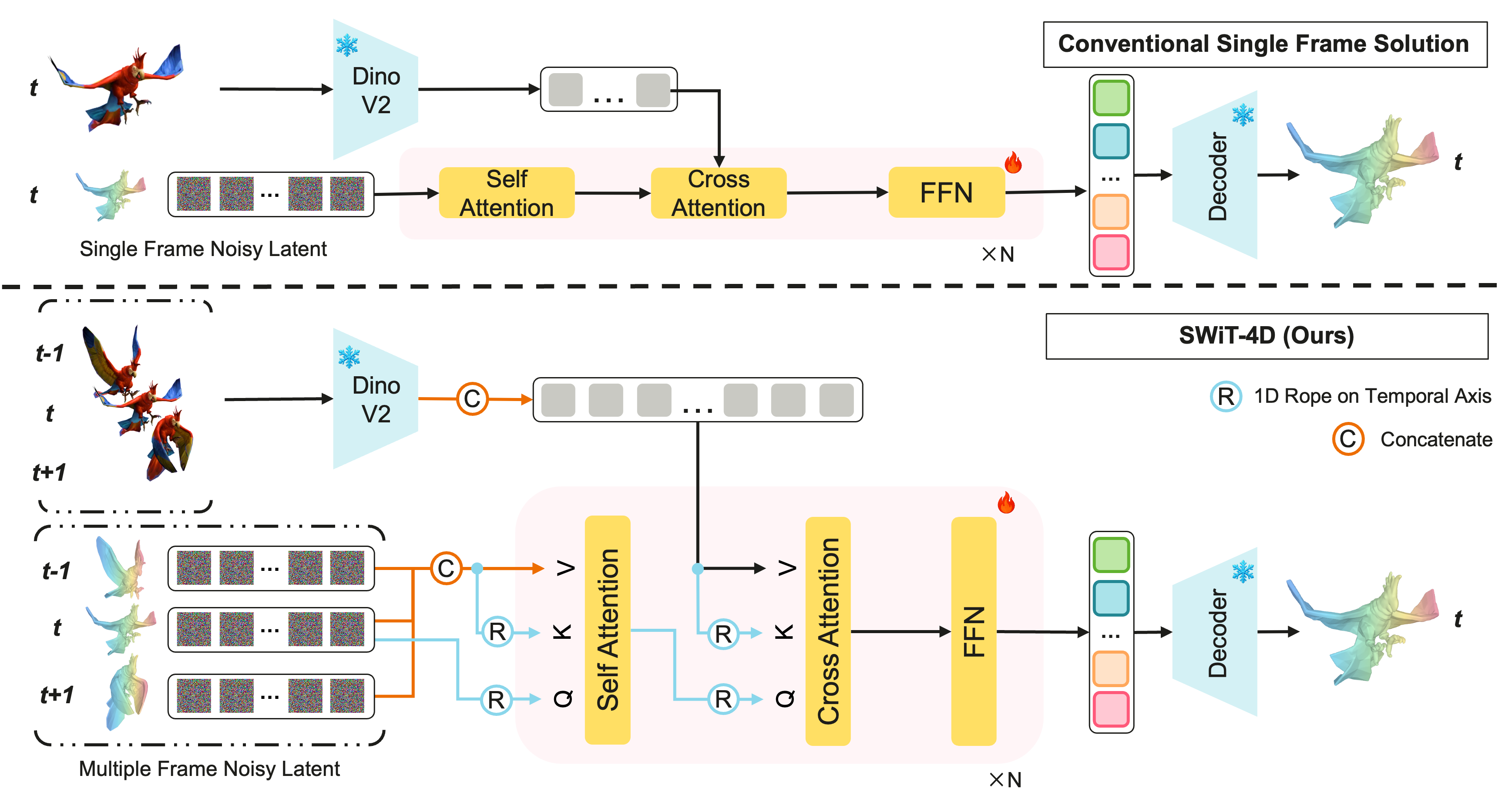 SWiT-4D, a parameter-free temporal extension to image-to-3D diffusion transformers. Top: Conventional single-frame 3D generation. A shape VAE encodes each 3D mesh into latent space, the diffusion transformer performs denoising, and the shape VAE decodes the latent back to 3D geometry—without any temporal reasoning. Bottom: Our method introduces temporal modeling losslessly through a sliding-window mechanism applied to both self- and cross-attention. A 1D rotary positional encoding (1D-RoPE) encodes temporal phase, ensuring identical behavior to the single-frame model when $W{=}0$, while enabling temporal residual learning when $W{>}0$. This design allows coherent motion perception and temporally consistent 4D generation without adding new parameters or supervision.